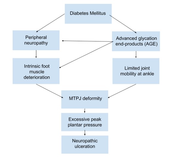 The hammering of the toe occurs as a result of intrinsic minus foot (i.e., a muscle atrophy due to neuropathy), in combination with the accumulation of advanced glycation end-products (AGE) from chronic hyperglycemia.[1][2] AGEs accumulation leads to soft tissue dysfunction, collagen stiffening, and decreased ankle joint mobility. Decreased ankle joint mobility increases stress to the forefoot and metatarsophalangeal (MTP) joints during weight bearing activities.[1][2] This process leads to high pressure points often at the very tip of the toe in the form of hyperkeratosis and ulceration (Figure 3).