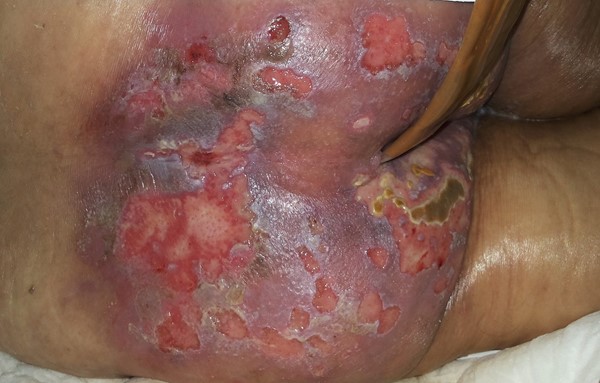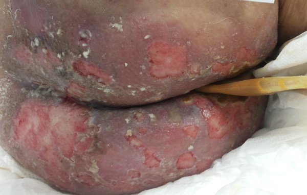 Fig. 1. Case 1. First day of placement of urinary and fecal diversion catheters. Skin with deep ulcerative lesions, areas of necrosis, and signs of fungal colonization