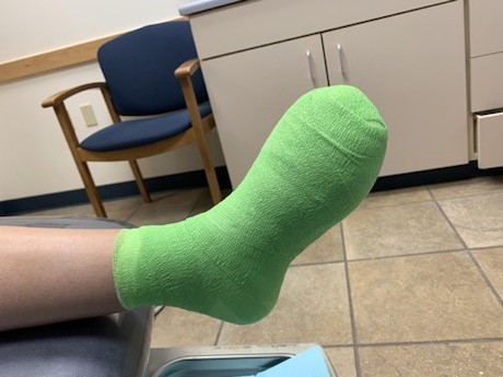 - Soft casting: also known as “football dressing” soft casting is composed of multiple layers of cast padding to the foot, followed by a layer of gauze bandage roll (e.g. Kerlix) and a layer of self-adherent wrap (e.g. Coban) (Figures 3 to 5).[7] This technique creates a snug bulky dressing with multiple layers of material between the foot and the ground, almost like a cast without the hard outer layer. It is not supposed to be removed, and is changed weekly. This is a good option for patients with knee, hip, and back problems because it does not alter their gait or limb length dramatically. It is also a good option for patients who are unable to don or doff devices. It should not be applied as tightly in the setting of vascular disease and thin fragile skin.