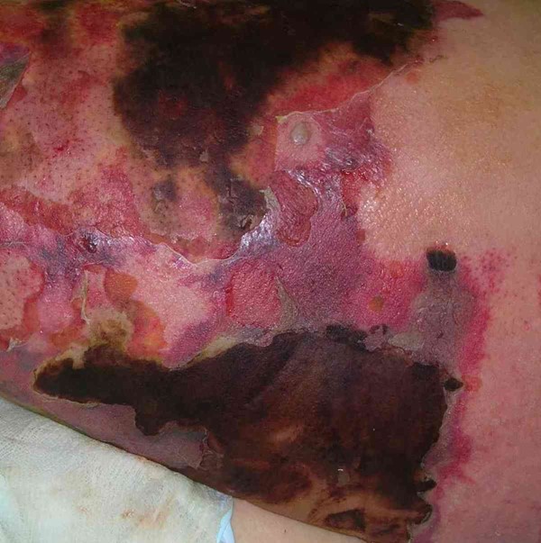 Trombley-Brennan terminal tissue injury [22]: A purple maroon discoloration that may appear suddenly on the body of a patient at the end of life. The patient will exhibit these skin changes on bony and non-bony prominences. Although, these injuries will never evolve into full thickness wounds with non viable tissue, they are frequently characterized by an increase in surface area. No drainage will be noted and linear and mirror images may appear on lower extremities. There are no complaints of discomfort with these areas.