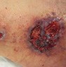 Kennedy terminal ulcer (KTU)[20][21]: described as lesions that present as pear, butterfly or horseshoe-shaped red/yellow/black ulcer, often on the sacrum or coccyx, that may occur suddenly (Figures 1 and 2). Patients with these wounds sometimes die in a matter of hours and sometimes live for more than 6 weeks after presentation of the ulcer.[22] The literature is unclear as to whether KTU should be considered a PU/PI or a separate skin problem that also occurs over a bony prominence.[23] At least for long term facilities, Medicare considers KTUs as unavoidable "pressure ulcers that generally occur at the end-of-life".[5]